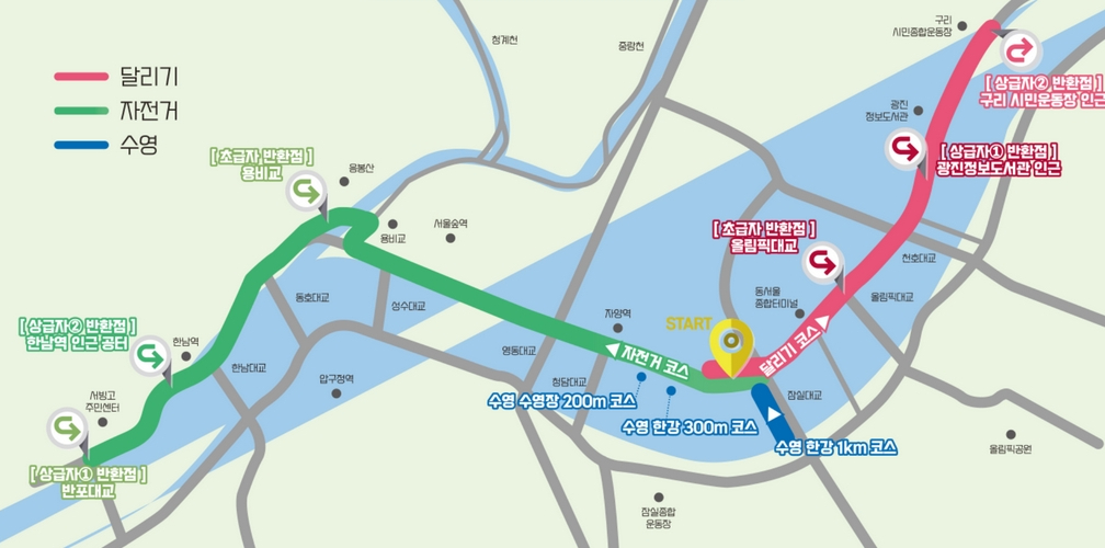 - ✔ 초급자2 코스 (15km): 한강 수영 300m + 자전거 10km + 달리기 5km
